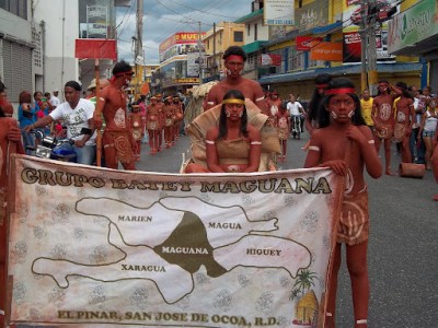 Arte, Poesía y Literatura En los campos de arte, poesía y literatura, los dominicanos han usado muchos temas indígenas (García Arévalo 1988). Trabajo de pintores cibaéños como Luis Muñós, Bottín Castellanos, y Gina Rodríguez usan temas Taínos y tecnología indígena en sus expresiones artísticas. Temas indígenas también aparecen en obras de poesía, literatura teatral y danza moderna. El merenguero Juan Luis Guerra, por ejemplo, usa muchos temas indígenas en su música—por ejemplo, hay una obra reciente que se llama Areito, nombre Taíno para una fiesta. En muchas canciones hace referencias a los Taínos, incluyendo los caciques Enriquillo y Anacaona. No podemos olvidar que el merengue y la bachata llevan instrumentos y ritmos indígenas, como es el uso de la güira.[37] Identidad Popular