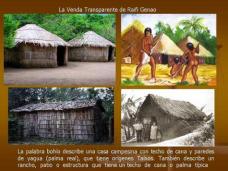 La palabra bohío describe una casa campesina con techo de cana y paredes de yagua (palma real), que tiene orígenes Taínos. También describe un rancho, patio o estructura que tiene techo de cana o palma típica. Los bohíos tienen forma circular, como el caney indígena. Pero también pueden ser construidos en una forma rectangular. Cana se usa, si esté disponible, porque resiste el agua y dura hasta veinte años; además tiene propiedades de ventilación. También un techo indígena se aprecia por su belleza y se usa en discotecas, restaurantes, hoteles, y galleras. Bejucos pueden ser usados para enganchar una estructura, pero los clavos son más comunes. Además casa hecho de yagua de la palma real son Taina en origen (Figura 8).[33] Folclor y Espiritualidad Popular