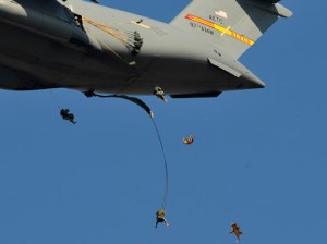 Tropas de paracaidistas y gatos, practican saltos en el desierto de california. Notese que los gatos no llevan paracaidas, dado que tienen la ventaja de que siempre caen sobre sus cuatro patas.