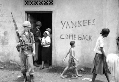 Ocurre, sin embargo, que la intervención se ejecuta por miedo al comunismo pero se afirma mediante la instalación de empresas industriales, bancarias, comerciales que se hacen al favor del poder militar interventor y del debilitamiento del poder político del país ocupado. Ese es el caso de la República Dominicana, que fue ocupada por las Fuerzas Armadas estadounidenses por miedo a que en el país se estableciera el comunismo y acabó siendo convertida en una neocolonia suministradora de trabajo asalariado barato, de facilidades para montar negocios, lo mismo industriales como la Gulf and Western o la Falconbridge que financieros como el Bank of America, el City Bank o el Chase Manhattan Bank.