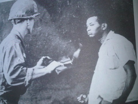Un humilde hombre del pueblo pide  a un soldado Yanqui  Invasor  dejarlo pasar para llevar a su niño herido a la Cruz Roja luego de un ataque indiscriminado por las tropas invasoras a la indefensa   población civil.