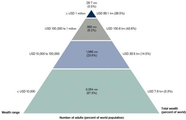 Esta pirámide, tomada del blog de Barry Ritholtz y que muestra la distribución de la riqueza mundial, pone de manifiesto cómo el 67,6% de la población económicamente activa (3.054 millones de personas) se reparte apenas el 3,3% de la riqueza, mientras sólo el 0,5% de las personas que habitan el planeta (29,7 millones) se reparten el 38,5% de los recursos.