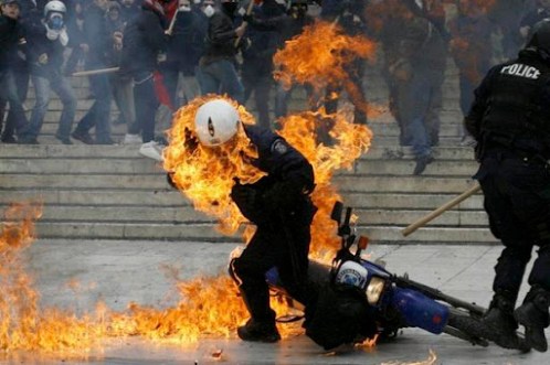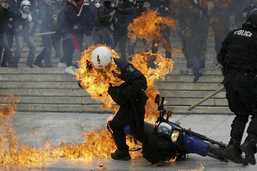 Atenas 23 de febrero 2011. Un policía tratando de escapar de las llamas de una bomba de gasolina lanzada contra él durante los disturbios en frente del Parlamento.