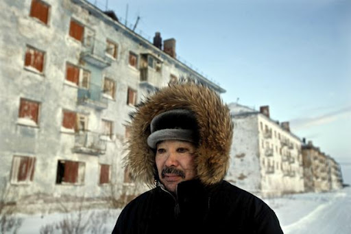 Karp Belgayev, un minero de carbón, caminando a través de su aldea abandonada cerca de Vorkuta en el Ártico. Es uno de los últimos diez habitantes. La mayor parte de las explotaciones de carbón que quedaron después de la era soviética fueron cerradas.