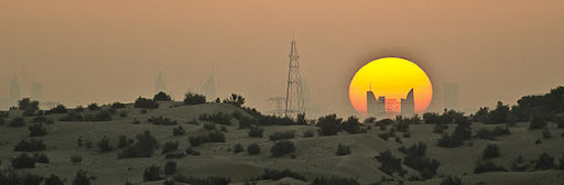 «Al fondo, frente al Sol, se observan los rascacielos y los interminables tendidos eléctricos que recorren ese país, en el que se está desarrollando una ciudad, una sociedad, en medio del desierto a costa de un importantísimo dispendio energético. La energía se obtiene del petróleo y se emplea, desde para desalinizar agua, hasta para mantener un ingente sistema de refrigeración. Un paraíso artificial que no concuerda con su ubicación».