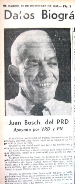 (La imagen reproducida a la derecha, apareció en el periódico El Caribe, del 20 de diciembre de 1962. Ese día, Juan Bosch fue electo presidente de la República Dominicana, dando inició al gobierno más democrático conocido por los dominicanos en el siglo xx.