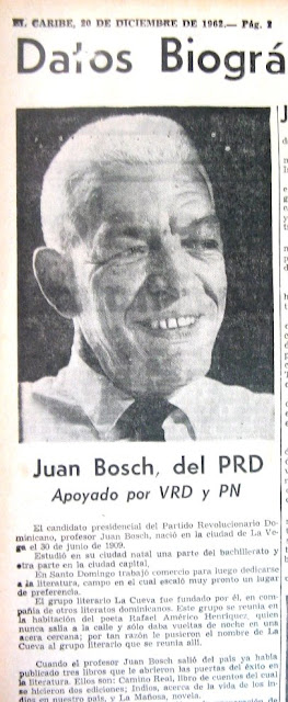 (La imagen reproducida a la derecha, apareció en el periódico El Caribe, del 20 de diciembre de 1962. Ese día, Juan Bosch fue electo presidente de la República Dominicana, dando inició al gobierno más democrático conocido por los dominicanos en el siglo xx. El 25 de septiembre de 1963, fue derrocado, para desgracia de la nación, por una coalición de fuerzas: los militares, la iglesia católica, la oligarquía y embajadas extranjeras. Sea la publicación del cuento “El Sacrificio” un sencillo aporte de este blog, a la memoria del maestro, a ciento tres años de su nacimiento).