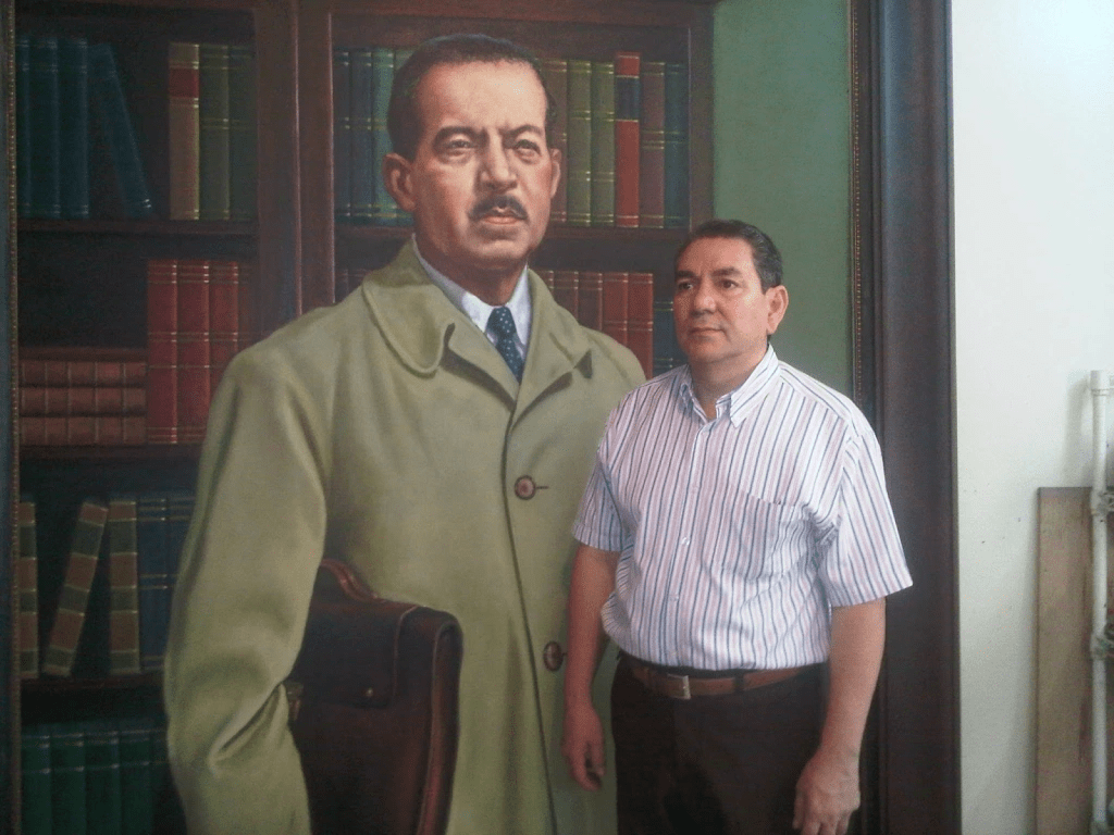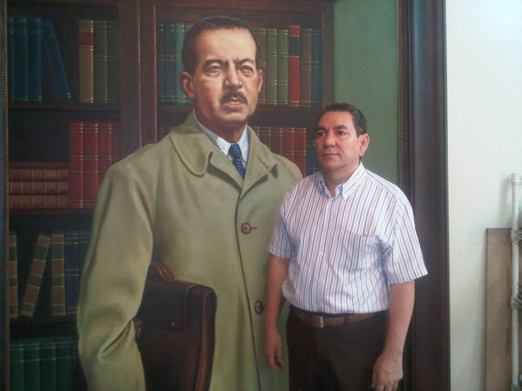 Domingo Nuñez Polanco posando frente pintura al oleo de Pedro Henríquez Ureña del pintor Miguel Nuñez, el pintor de la patria