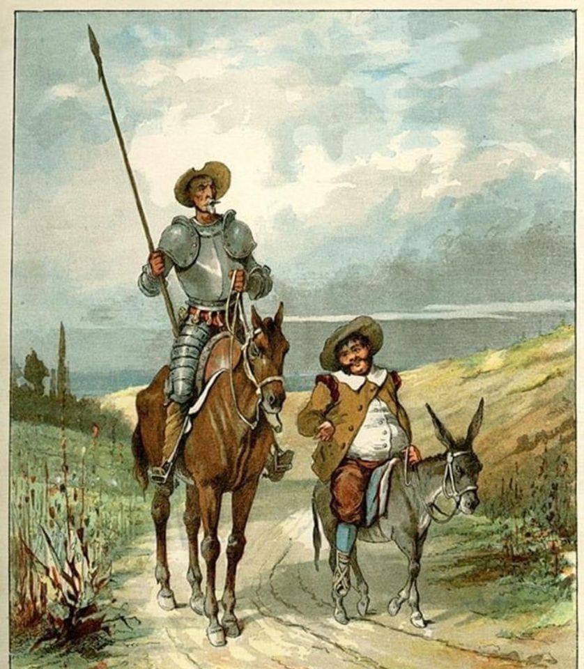 El utópico e intrépido Quijote de la Mancha y su fiel servidor Sancho, toman descanso en la vereda del camino, luego de fatigables y largas caminatas en busca de glorias y conquistas don Quijote dice a Pancho: