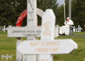 El pontífice viajó a Canadá tras la invitación de los pueblos originarios para que viniese a disculparse por los abusos perpetrados en los internados gestionados, muchos de ellos, por la Iglesia católica y donde cerca 150 000 niños fueron arrancados de sus familias, mientras que se ha estimado que más de 4 000 murieron por los maltratos y las enfermedades. La mayoría enterrados en fosas comunes sin ninguna identificación.